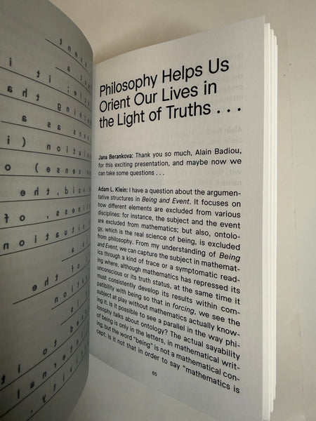 The book includes an introduction by Nick Nesbitt, Kenneth Reinhard's article "Alain Badiou's Fundamental Philosophy," and Jana Ndiaye Berankova's postface on The Immanence of Truths, which discusses the attributes of the absolute and Badiou's connection with Spinoza.